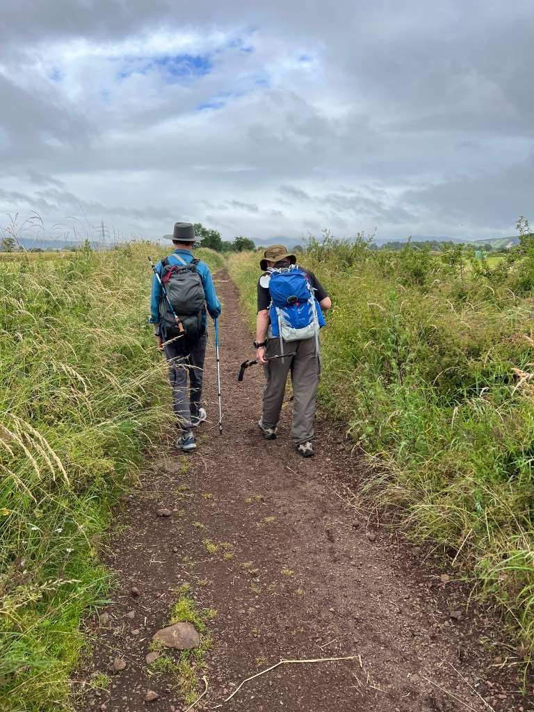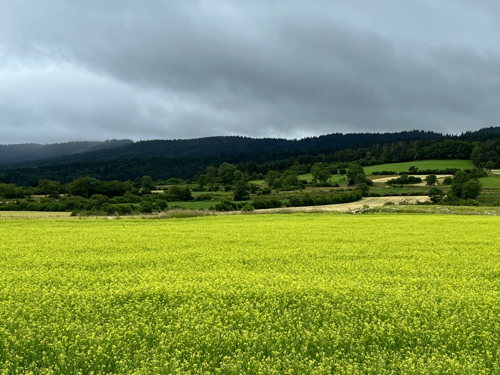 I’m not even sure where to begin. Today was a multitude of days all contained within about 10 miles of waking. We started in Le-Puy-en-Valley and ended in Montbonnet, crossing farmlands, fields, tiny villages, and many hills. The day was relatively cool (low 60’s) and it rained on and off throughout the morning and afternoon. The scenery was spectacular! There were wildflowers everywhere; bursts of yellow and pink and purple and blue and white. There were fields of light green and dark green and muted yellow and bursts of bright blue shining through dark clouds. The rain was mostly mist but also occasionally came down in heavy sheets.