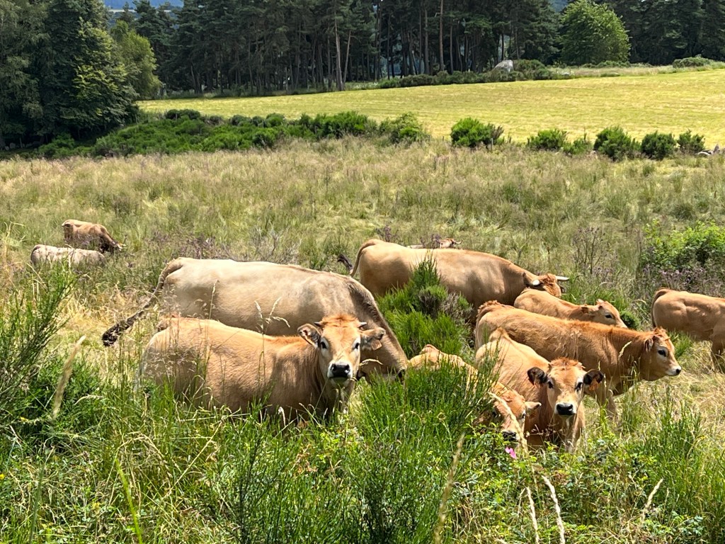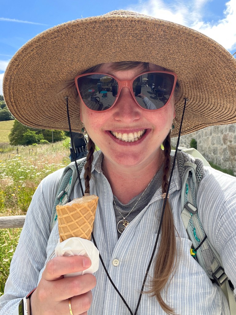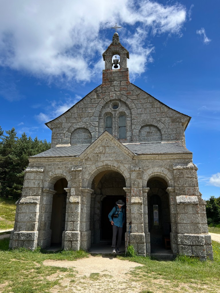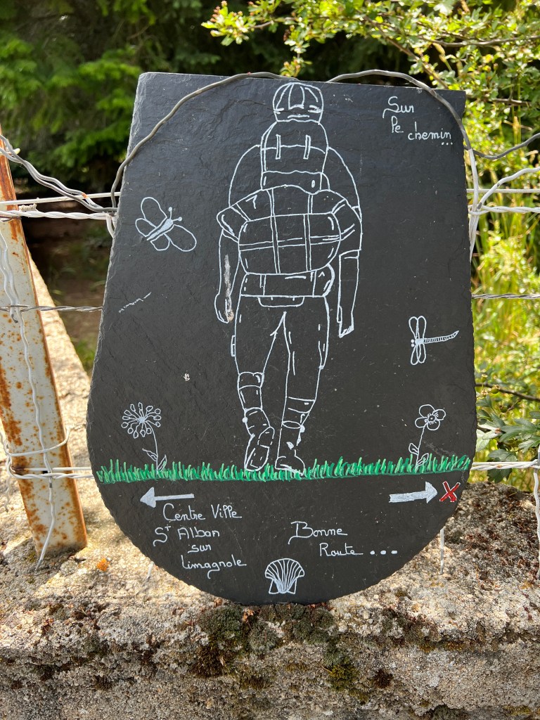 The day began with a light, misty rain and lovely forested paths. We stopped for tea and ice cream at Domaine du Sauvage, a well known, and loved, pilgrim accommodation along the way. We continued through managed forests and open fields and I think our bodies are starting to feel the strain of walking about 50 miles at this point. I wish I had scheduled a rest day a little sooner, but oh well, we are managing and are still having an amazing time. All in all, today ended up being about 2 miles longer than the guide books said and we felt it. Luckily our dinner (at Les Drailles de la Margeride where we were staying) was once again amazing: salad with a handmade chèvre and honey pastry, pork and mango curry, a cheese course, and possibly the best crème brûle I have ever had. I also finally found a French cider! This isn’t really the region for them, but I’ll keep looking!