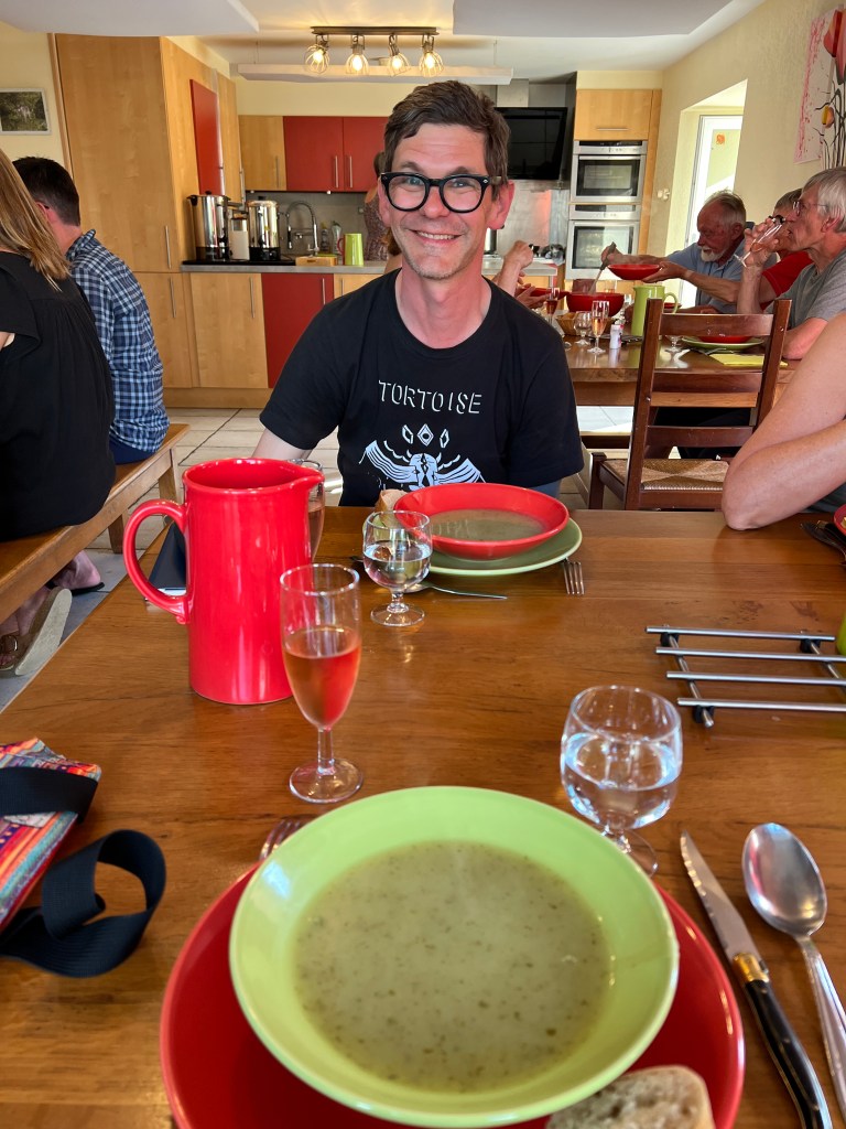 Tonight we stayed at a more traditional Gîte, Sentiers Fleuris, and enjoyed a communal dinner of homemade potato, leak, and lovage soup (lovage from the garden), local sausage, potatoes au gratin, and crème brûle. We were glad the dinner only lasted about an hour (they often go for 2+) so we could turn in early and prepare for our first 15 mile day tomorrow across the Aubrac Plateau.