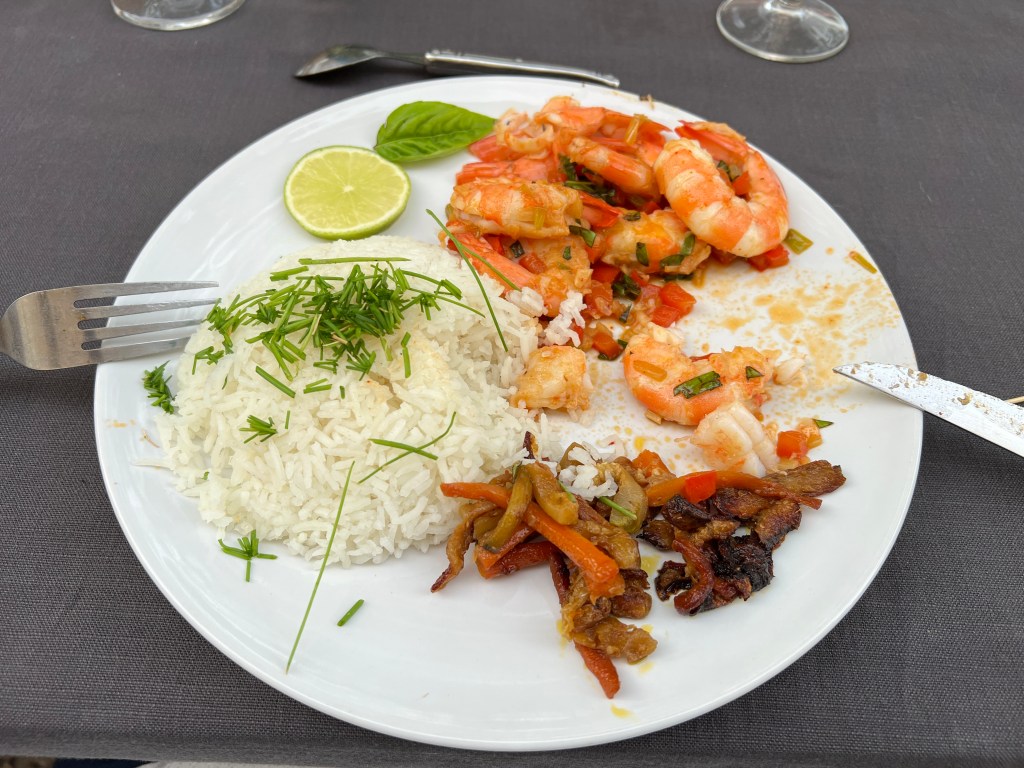 Our accommodation for the evening was absolutely fabulous! We stayed at the Chambre d’Hôtes, Les Hauts de Lascabanes. Our little cabin was like staying in a treehouse. Our hosts were, of course, wonderful and prepared a delicious meal of shrimp, rice, and veggies. They also shared copious amounts of local rosé, which we fully enjoyed! There was one other couple, and their 14 month old son, staying the night. They were British living in Antigua and on holiday in France. It was nice to be able to converse in English for the evening, something quite rare on this trip (and of course not the reason we came to France, but nice all the same). Our evening concluded with warnings of a Thunderstorm, which ended up being quite the event! We were woken up around 3am to giant hail, brilliant lightning, and cracking thunder.